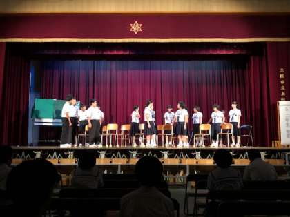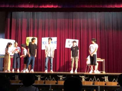 2年生の演劇は、SNSをはじめネット環境につかり切った日常を、少し立ち止まり違う角度から考えたりすることや、答えがないからこそ、自分たちで「何をすべきか」を考えていこうと訴えかけるものになっています。