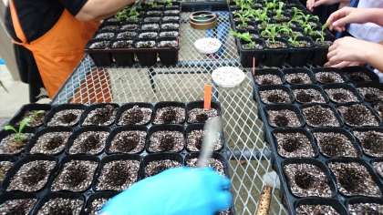 育った苗をパレットからピンセットで取り出して、ポッドに棒で開けた穴へ移植し、固形肥料も加えました。