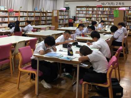 2日目に、大学生ボランティアと地域ボランティアの人数が足りなかった為、2年生と3年生が合同で、図書室で学習会を行うことになりました。学年の先生方も来てくださり、生徒が次々と質問をしたり、いつもより静かに真面目に取り組んでいました。3日間とも全学年時間を延長しましたが、最後まで集中しているようでした。