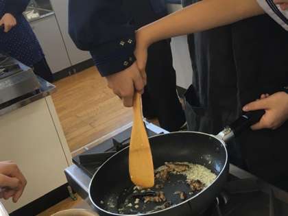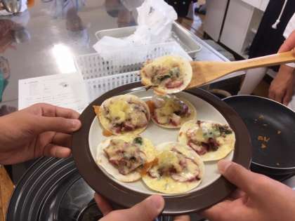 技術科で育てたラディッシュを朝に収穫し、にんにく・オイルサーディンとともに炒め、餃子の皮にのせ、チーズをまぶしてフライパンで焼きます。どの班も上手に調理をしていました!