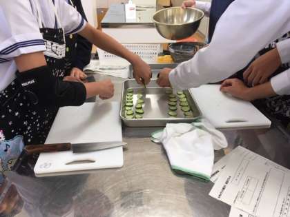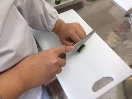 10月29日(火)〜31日(木)までの期間で各クラス、キュウリの輪切りの実技テストを兼ねて、調理実習を行いました。真剣なまなざしで少し緊張しながらですが、正しく包丁を持ち、2ミリ程度の輪切りを目標に励んでくれました。
