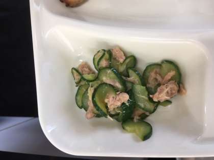 切ったキュウリとツナを、酢・砂糖・しょうゆ・ごま油で調味液を作って和えて、給食に1品加えて美味しくいただきました。