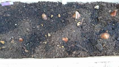 園芸部では、小学生部活動体験の時、プランターにチューリップの球根を植えました。