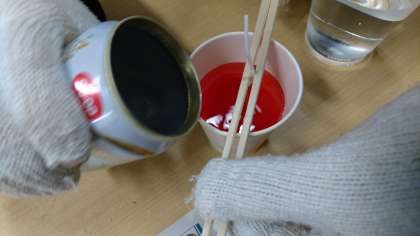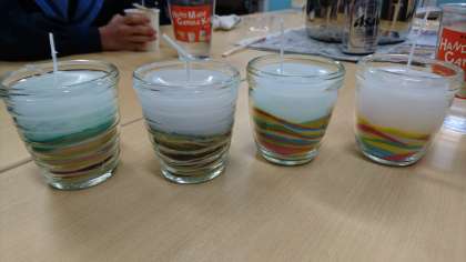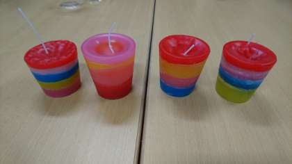 2個目は、紙コップに着色したロウを幾重にも注いで作りました。(写真中下)