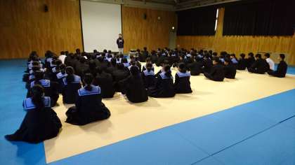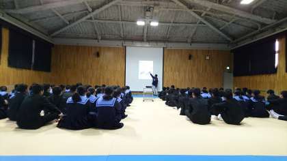 月曜日1限目、2年生は武道場に集合し、今週土曜日に実施される「上町防災活動」の事前指導を行いました。