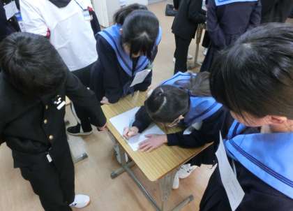 12月5日(木)の5,6限に中央聴覚支援学校に訪問して交流会を行いました。レクリエーションで喋ったり、指文字を使わずに名前順で並んでみたり、絵しりとり、共通点探しなど、たくさんのレクリエーションで交流ができました。