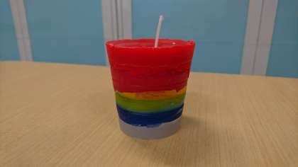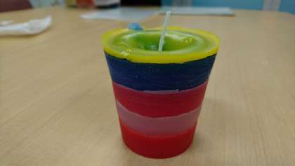 紙コップに、着色したロウを幾重にも注いで作りました。