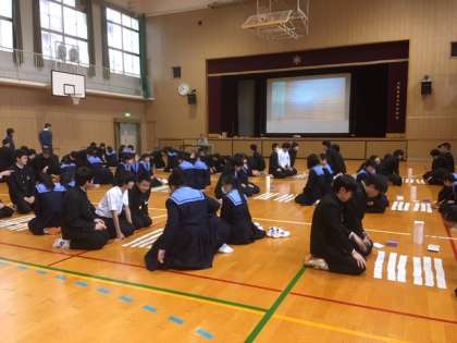67期生にとっては1年から毎年行い3回目となります。学校で行うかるた大会なので、枚数を競うだけでなく、その歌の作者や文法的なことをはさみながら和気あいあいと楽しくできました。