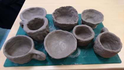 それを使って今日は、「玉作り」と「ひも作り」(手びねり)で、コーヒーカップや湯飲み茶碗、お皿等を作りました。