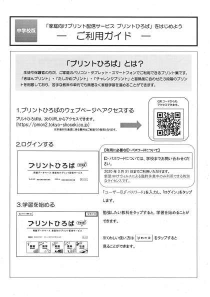 この度、大阪市教育委員会より子どもたちが授業を十分に受けることができないことによって、学習に著しく遅れが生じることがないよう、家庭向けプリント配信サービス「問題データベースプリントひろば」の利用案内がありました。(学校ホームページに掲載済)