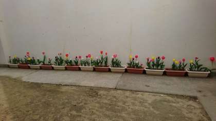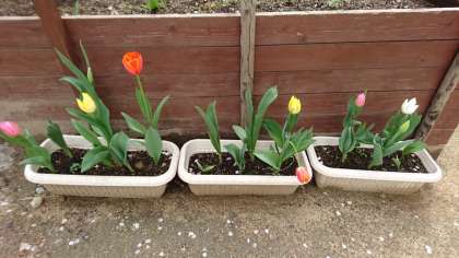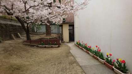 昨年11月の小学生部活動体験で、プランターに植えた球根のチューリップが、新入生を歓迎するように、満開になりました。