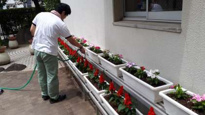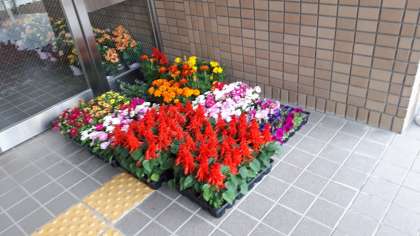 PTA緑化活動の素敵な花の苗が届きましたが、例年は保護者の皆さんといっしょに植えるのですが、今年は現状を鑑みて管理作業員さんがプランターに植え替えてくれました。