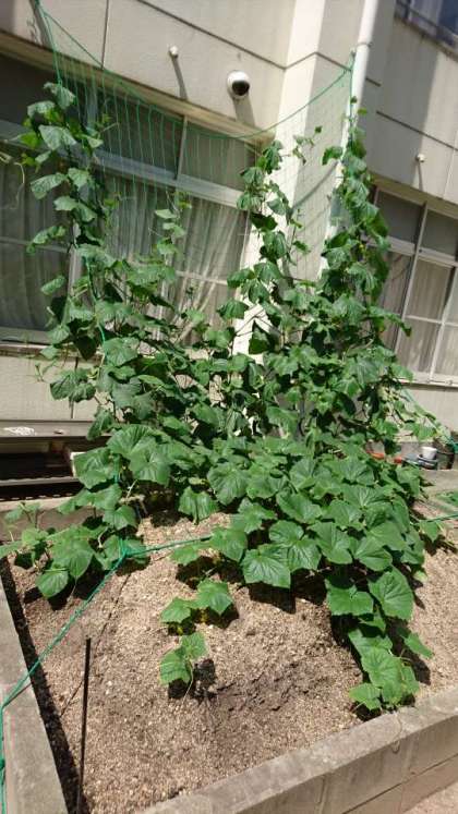 また、例年校舎の2Fまで上げていたゴーヤーのネットを3Fまで上げたため、強風でネットが揺さ振られやすくなり、3分の1の苗が根っこから引きちぎられて、枯れてしまいました。