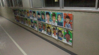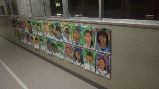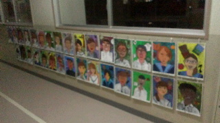 1年生の各教室前の廊下に、美術科の授業で制作した自画像を展示しています。それぞれ個性的で素晴らしい力作ぞろいです。学期末まで展示いたしますので、懇談等で来校された時に是非ともご鑑賞ください。