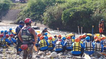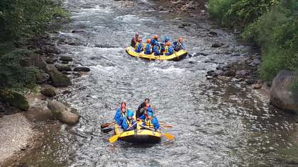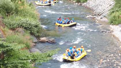 いよいよ体験開始です。先ずは、ラフティング。スーツに着替え、姫川を楽しくくだりました。