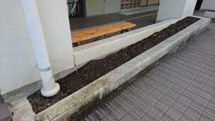 青空教室前にある中庭の花壇に、ミックスフラワーガーデンと忘れな草の種まきをしました。