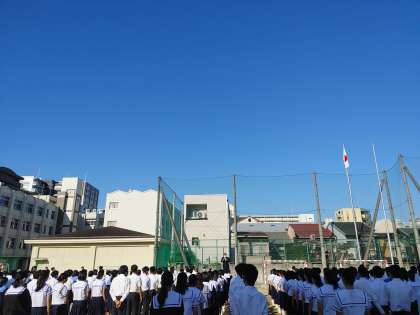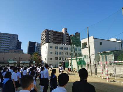 雲一つない秋晴れの中、運動場での全校集会でした。朝夕は涼しく、日中は汗ばむほどの気温です。体調管理には十分に気を付けましょう。