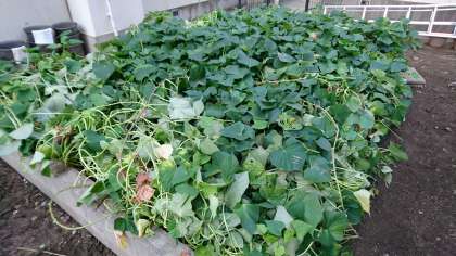 園芸部では、来週の芋掘りに向けて、畑の外側まで伸びたサツマイモのつるを、畑の内側に「つる返し」をしました。