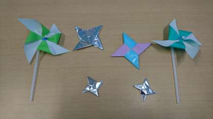 青空学級の作業学習の時間に、折り紙で風車や手裏剣・折り鶴等を作りました。