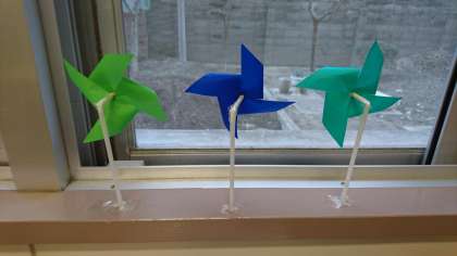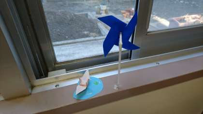 風車は窓際に立てて、換気の確認用にしています。