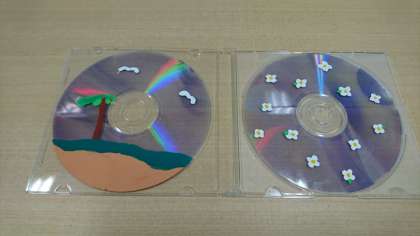 作業学習の時間に、CD盤に色を塗って、鳥除けを作りました。