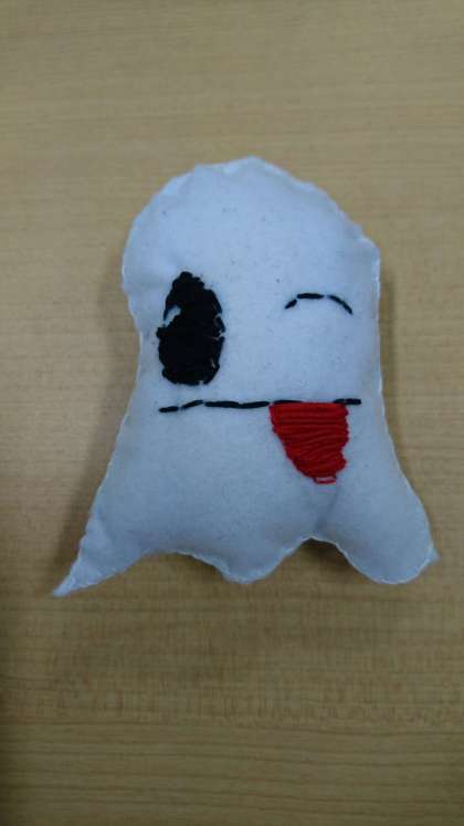 生徒がフェルトに綿を入れて刺繍し、かわいいオバケの飾りを作りました。