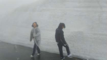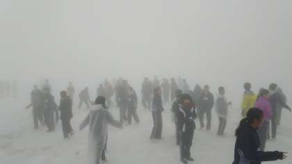鞍岳の畳平での雪遊びです。ガスが濃く、視界が悪いですが、駐車場に積もった雪で思う存分遊びました。3度という気温でしたが、寒さもぶっ飛ばすぐらいのみんなのはしゃぎようでした。