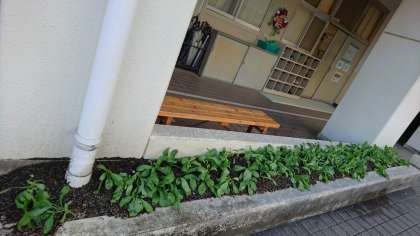 中央区緑化活動の一環として、区役所・大阪城公園事務所の方々の協力で、生徒会と園芸部が合同で行った「秋の種花活動」のキンセンカが順調に育ったので、中庭の花壇に苗を移植しました。