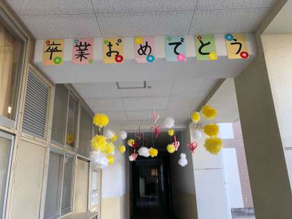 卒業生を祝福するため、在校生が作業学習の時間にメッセージやポンポン等を作って、青空教室前廊下を装飾しました。