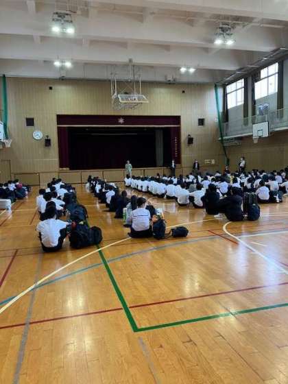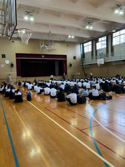 3年生修学旅行、朝8時10分に体育館に集合し、予定通りに出発式が行われました。