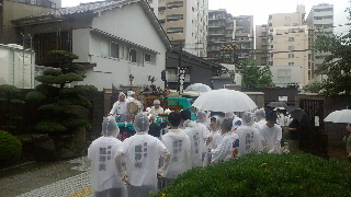 午後一時すぎに学校を出発し、大雨の中、元気よく「わっしょい わっしょい」の掛け声をかけ、空堀商店街・桃谷会館周辺・上町筋まで練り歩きました。