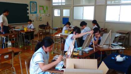 油絵や水彩画を各面に施した立体作品など、さすが美術部と思える作品を一人ひとりが集中して製作しています。