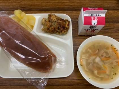 本日の給食です。 ・パン ・カレードリア ・豚肉とキャベツのスープ ・りんご(カット)