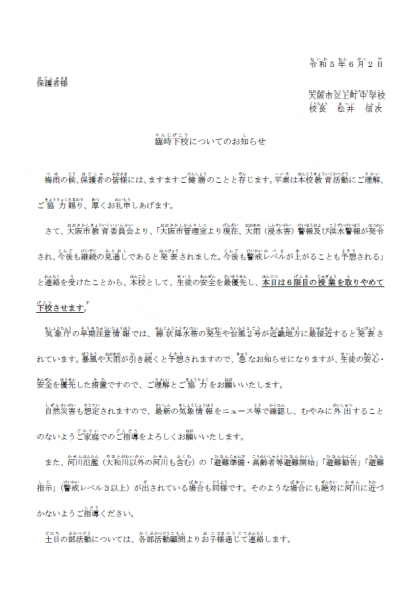 本日、お子様に、上記の通りの保護者プリントを配付しております。