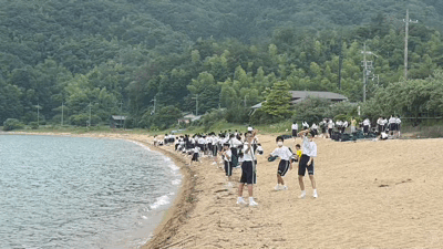 係の仕事で片付けをする人、海を眺める人、歌を歌う人、走ったり飛んだりする人、貝殻を集める人。