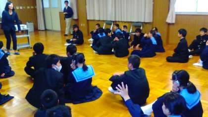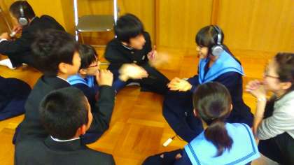 今日、1年生が聴覚特別支援学校との交流に向けて、各クラスごとに難聴体験学習を行いました。聴覚特別支援学校から先生お二人に来ていただき、実際にヘッドホンをつけて、耳が聞こえにくいとはどういう状態かを班ごとに全員が体験しました。