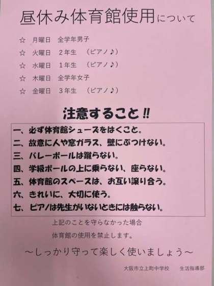 写真は、お昼休み、体育館を学年を決めて開放をしている様子です。