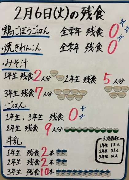 2月5日〜9日の間、保健委員会の生徒が考えた取り組みで「完食大作戦」と名づけ、クラスごとに残食をはかっています。