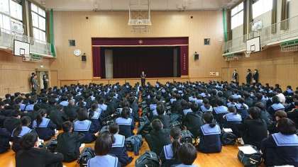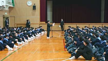 登校後、2,3年生には新しいクラスが発表されました。毎年のことですが、いろいろな感情があふれ出します。その後、全校生徒が揃って、着任式・対面式・第1学期始業式が行われました。緊張した表情と、新学年に向けたやる気に満ちた表情が入り混じっていました。
