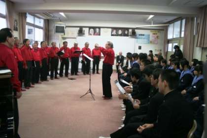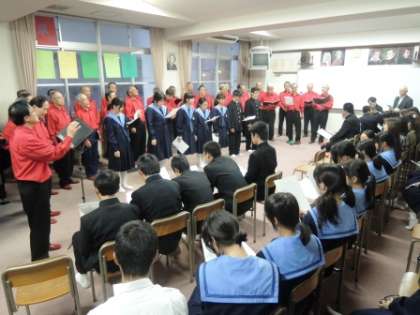 アンコールでは観客も加わって「ふるさと」を合唱。昴メンバーの迫力あるハーモニーと、生徒たちの伸びやかな歌声の共演に、集まった約40人の生徒たちから大きな拍手がわきました。