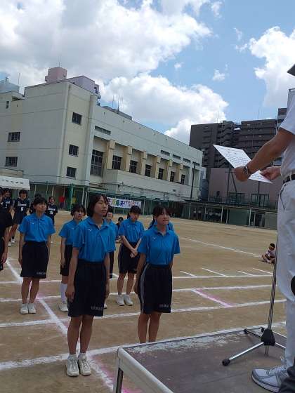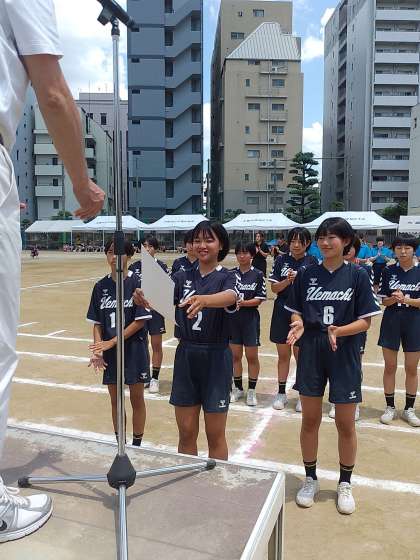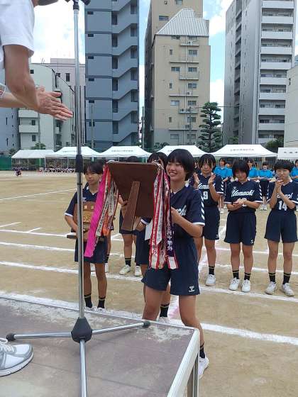 午後の部のはじめに、大阪市総合体育大会で3位のバドミントン部と優勝の女子ハンドボール部の表彰を行いました。
