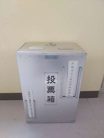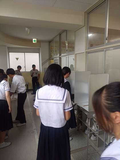 3年社会科の授業で、実際の選挙で使う投票箱や記入台を大阪市選挙管理委員会からお借りし模擬投票を行いました。授業の始めに小選挙区制や比例代表制、重複立候補などについて学習し、投票用紙を受け取り投票しました。立会人の確認も行いました。