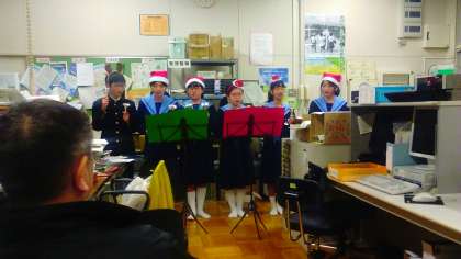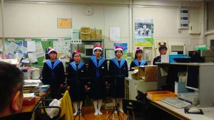 合唱部のみんなが、「先生方にも素敵なクリスマスをプレゼントしたい!」ということで、夕刻に職員室を訪れ、残っていた半数近い先生方の前でハンドベル演奏や優しい歌声で温かい気持ちにさせてくれました。