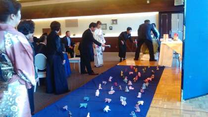 原田会長様の年頭のごあいさつの後、盛大に鏡開きが行われ、それぞれのテーブルで歓談が始まり、最後に趣向を凝らした「お楽しみ輪投げ大会」もあり、全員の方がお土産を持って帰られました。