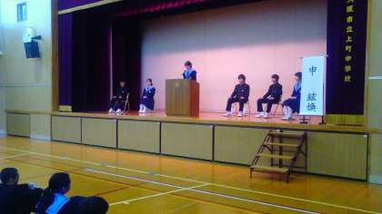 対立候補者のいない信任投票になりましたが、立候補者全員が上町中をより良い学校にするための考えと決意を述べてくれました。学校を良くするのも悪くするのも全校生徒一人ひとりの気持ちと行動次第ですが、その方向付けや手助けをするのが生徒会です。また、専門委員会や各係活動などで全員の生徒が何らかの形で学校づくりに携わっていることもしっかり確認し、生徒会役員とともにさらに素晴らしい学校を築いていこう!