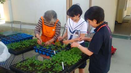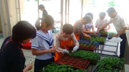 今日のテスト終了後の午後、区役所の方々、ボランティアの方々が来られ、前回の種植え後、少し育った苗をやや大きめのポットに植え替えました。生徒会のメンバーが参加してくれ、丁寧に作業してくれました。これだけ愛情をかければ、きっときれいな花が咲くと思います。みなさんも楽しみにしておいてくださいね!