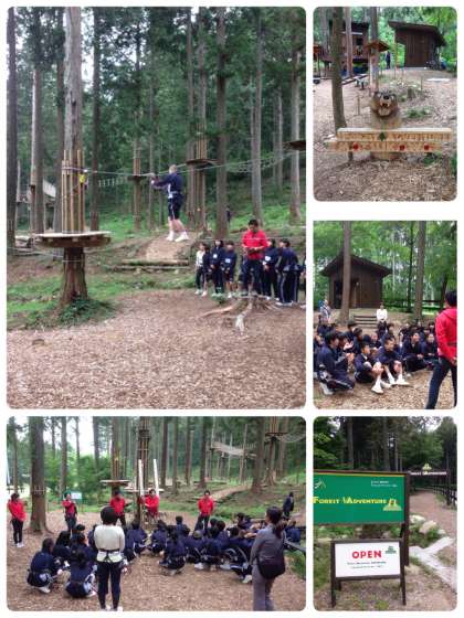 フォレストアドベンチャーは、セーフティトークのあと説明を受けて始めました。四人一組で助け合いながらクリアしていきます。全部クリアできるかな?