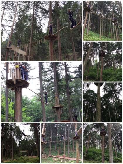 フォレストアドベンチャーは、セーフティトークのあと説明を受けて始めました。四人一組で助け合いながらクリアしていきます。全部クリアできるかな?