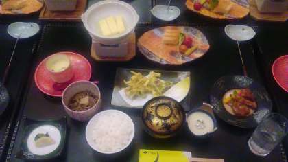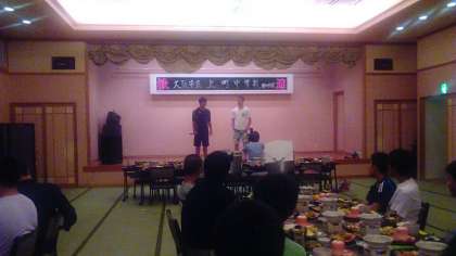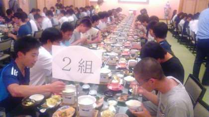 いよいよ夕食です。食事係の楽しい「いただきます?」で始まり、みんな美味しそうに食べていました。中には、5杯、6杯とおかわりする人もいて、中学生の若さとパワーを感じました。食後の温かいお茶が意外に人気で、特に女子が列をつくっていました。最後も食事係が全体を盛り上げ、元気な「ごちそうさま」で食事を終えました。このあとは、室内レクです。