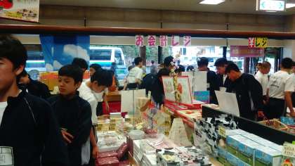 雪遊びの後、今回初めてのお土産タイムがありました。みんな「待ってました」とばかりにカゴを持ってあれこれ味見もしながら、相手を思い浮かべながら楽しそうに買い物をしていました。